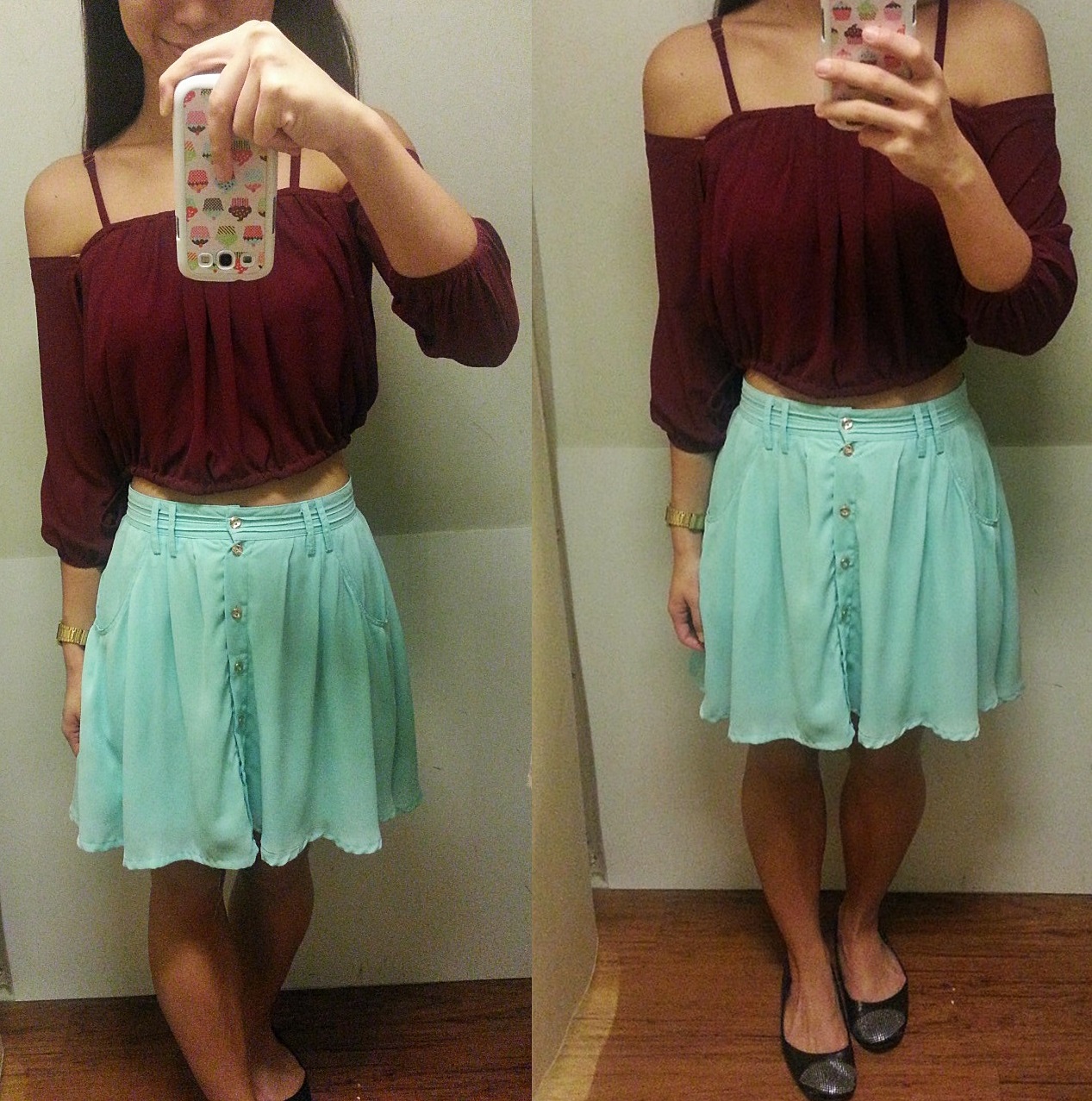 Tried the Off Shoulder Top with Straps in Burgundy this time round, but in Size S. Was pretty surprised I can fit into Size S & I find the fit better. More cropped & don't look so baggy at the chest area. Perfer the Burgundy over the Lavender & definitely a Size S :)